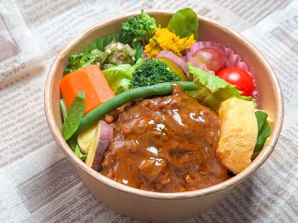 特製デミグラスソースをかけたハンバーグを主菜に、野菜もしっかり入った彩りあるお弁当です。