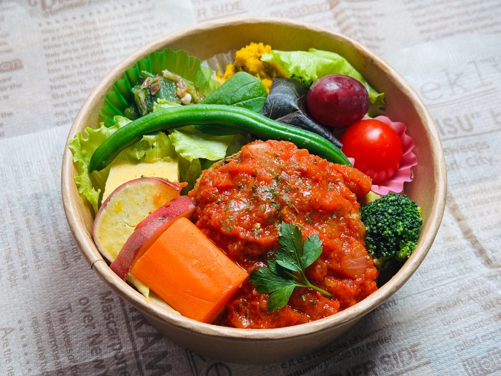 玉ねぎと一緒に煮込んだトマトソースをかけたハンバーグを主菜に、野菜もしっかり入った彩りあるお弁当です。