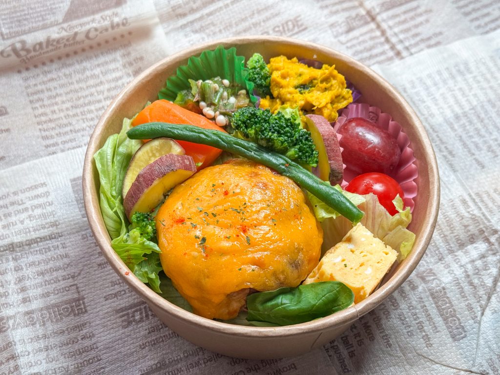 チェダーチーズをのせたハンバーグを主菜に、野菜もしっかり入った彩りあるお弁当です。