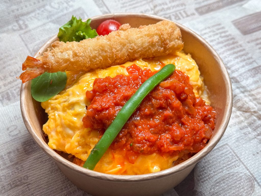 玉ねぎと一緒に煮込んだトマトソースがかかったふわとろ玉子のオムライス。エビフライと一緒にお楽しみください。
